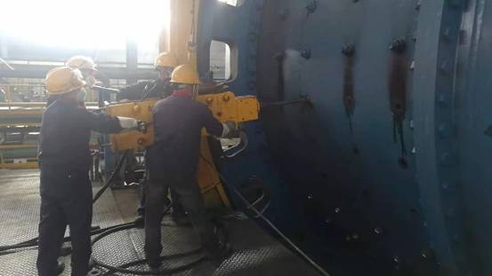(下圖為半自磨磨機(jī)筒體襯板更換現(xiàn)場(chǎng))
